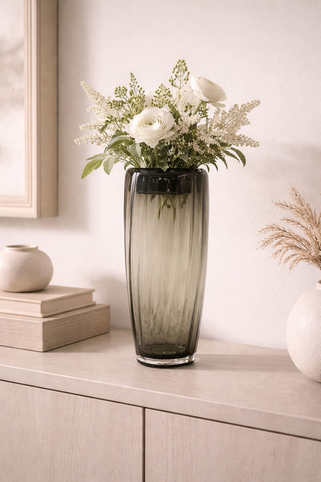 • Ramo de flores blancas en jarrón gris (1)